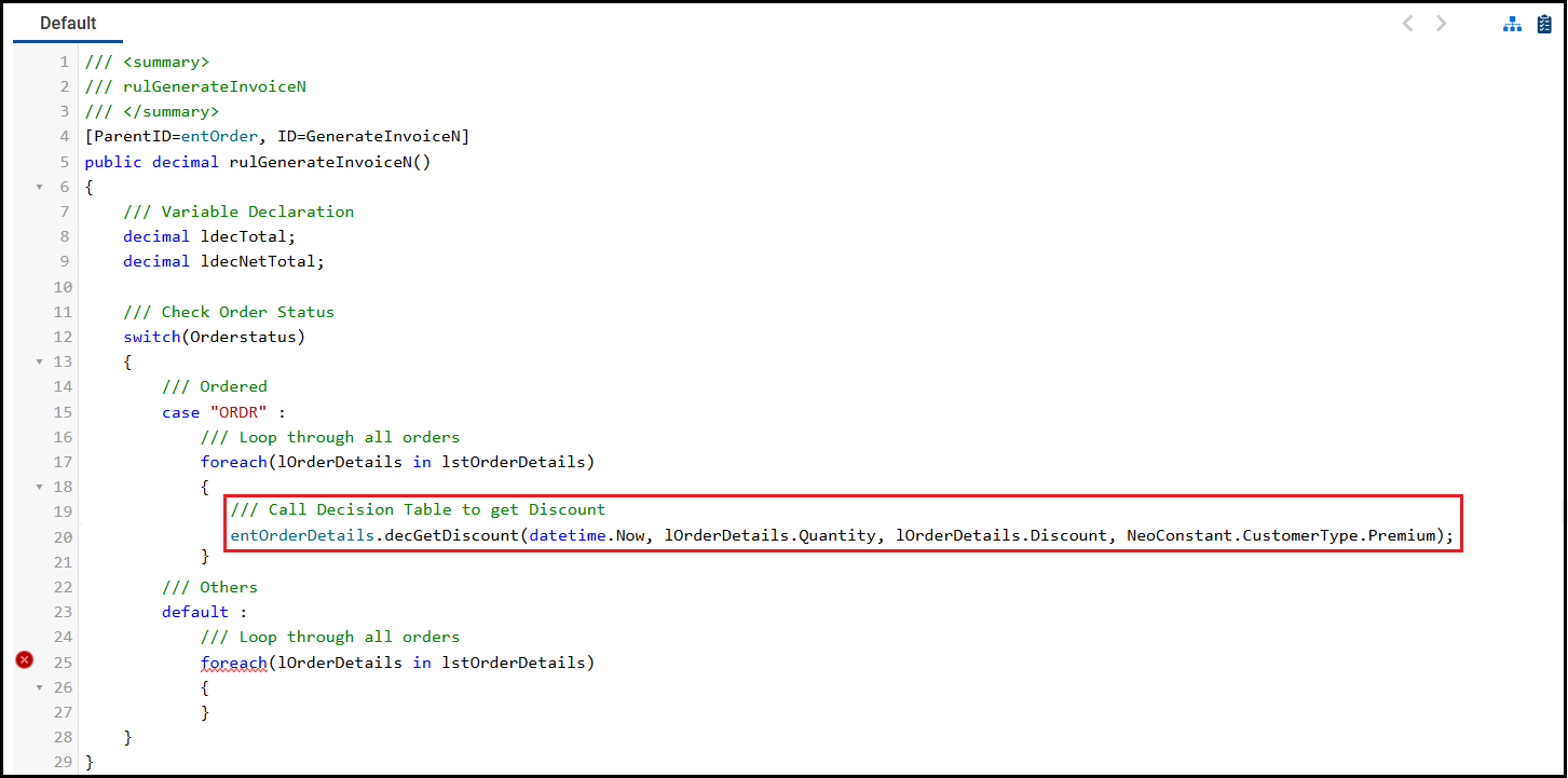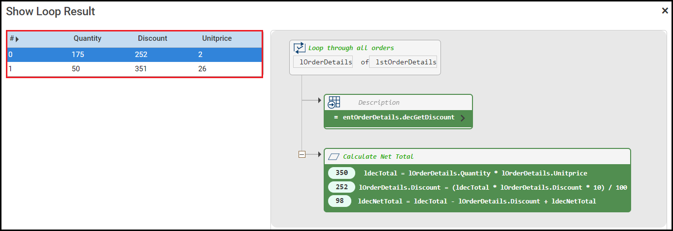 Add a decision table inside the first For Each loop using the ID which is the name of the decision table you’re calling to calculate the discount.