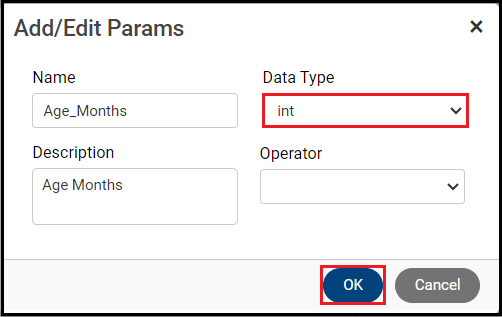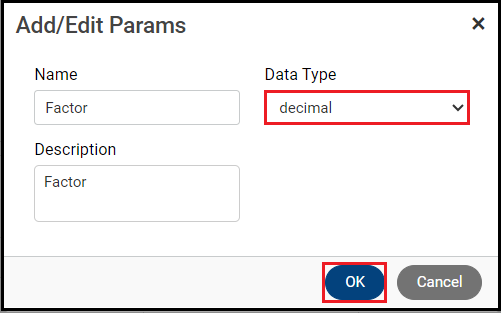 If you are using a return parameter, drag the desired column to the Return Parameters section. Enter the Name and Data Type, then click OK.