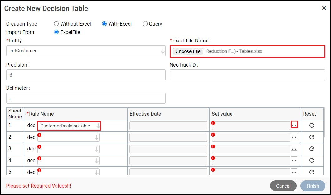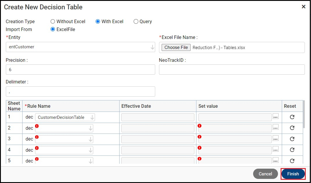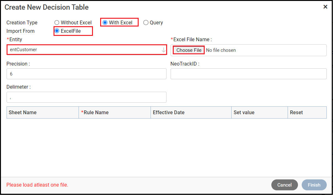 To create a decision table with an Excel file, select the With Import Excel radio button.