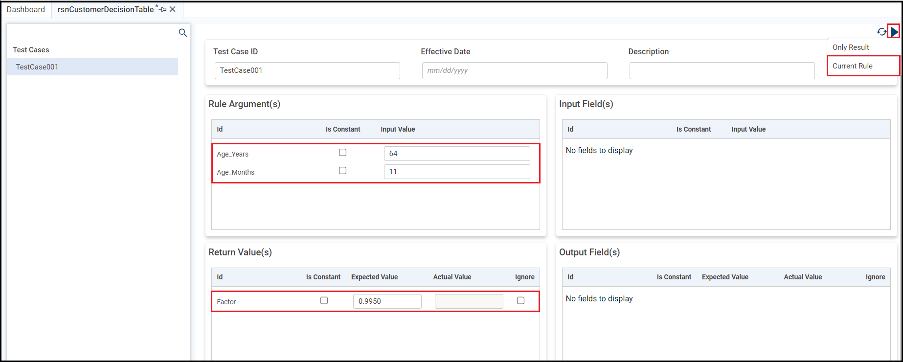 Enter the Input Value and Expected Value. Click the Run Test icon and select Current Rule to execute the rule with the input values you entered.