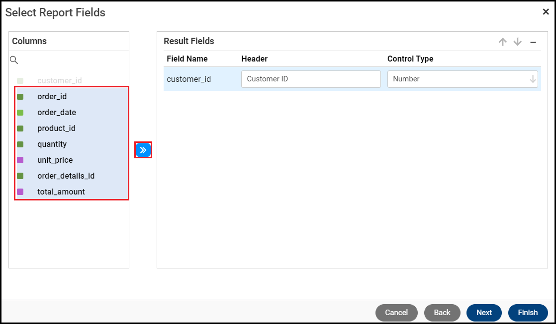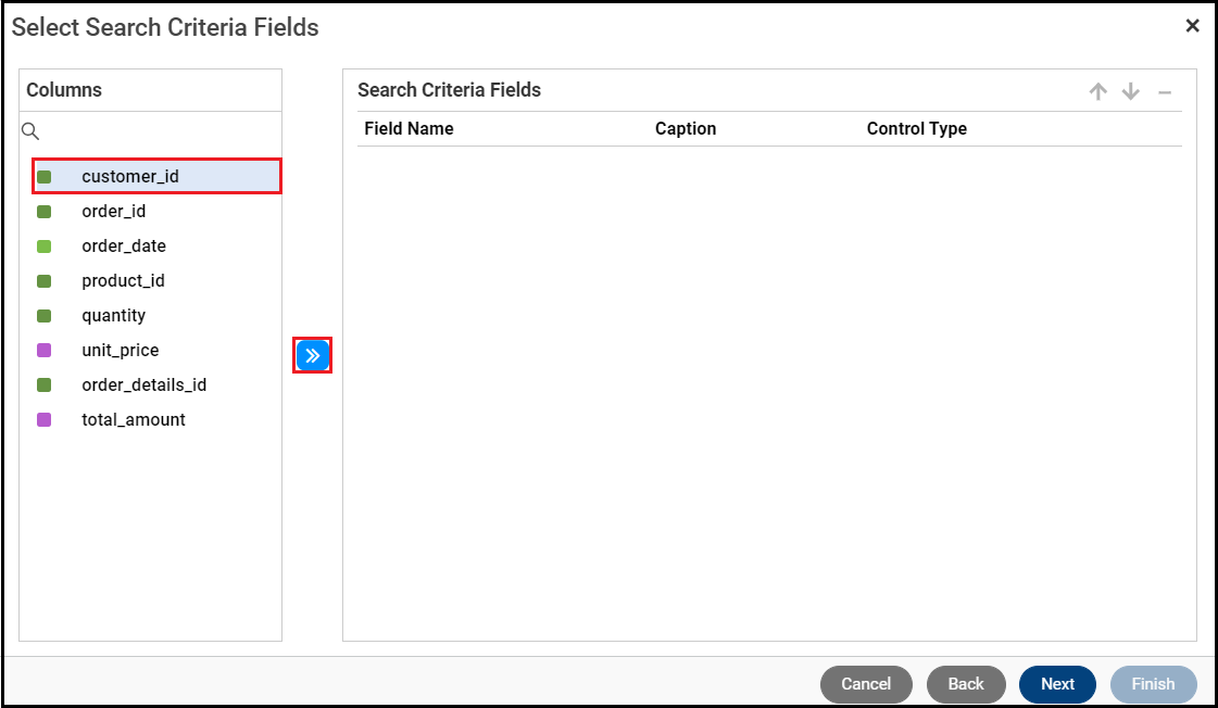 Select the fields you want to use as the report's search criteria. This example selects one field, customer_id.