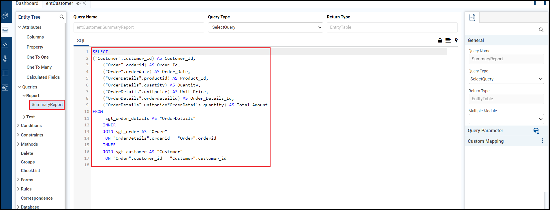 The query SummaryReport is configured in entCustomer