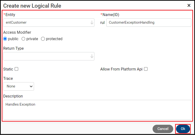 - Static: If checked, the rule will be available to call from anywhere. Otherwise, you will have to call it from an instance of its object. A logical rule can directly use the entity attributes if it is not static.