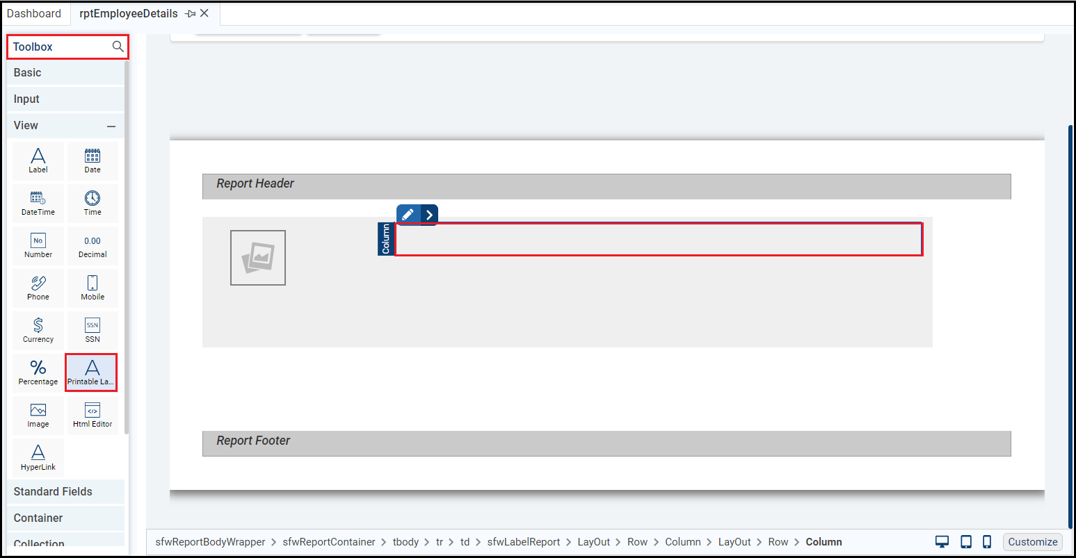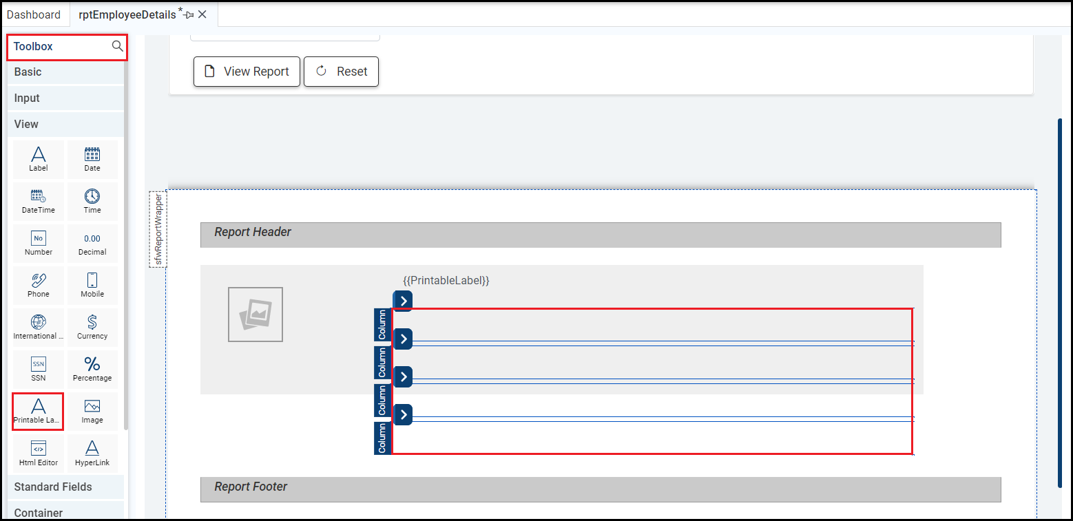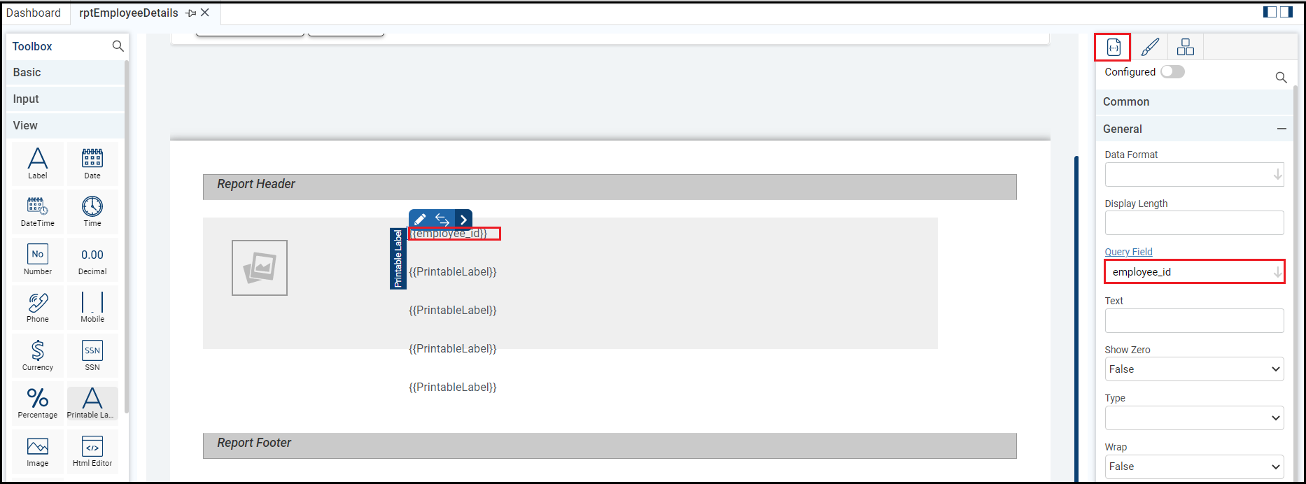 This example displays employee details in the right column. Add a printable label to each row. For which, drag and drop the Printable Label control from the View section of the Toolbox in the first row of the second column of report layout.