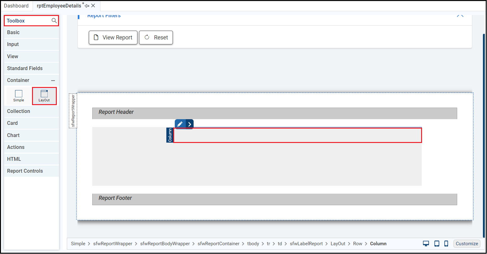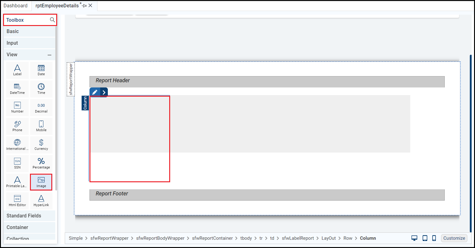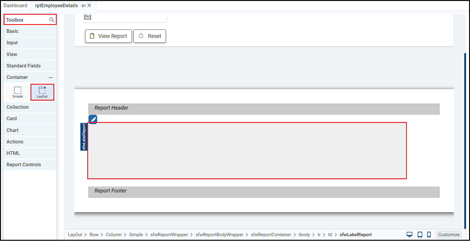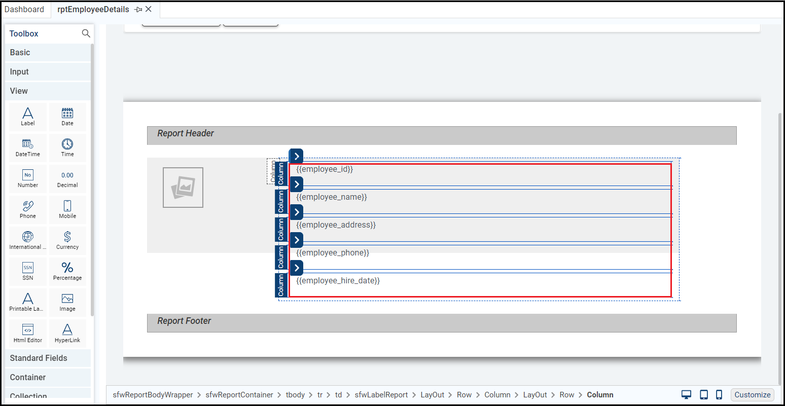 This example displays employee details in the right column. Add a printable label to each row. For which, drag and drop the Printable Label control from the View section of the Toolbox in the first row of the second column of report layout.