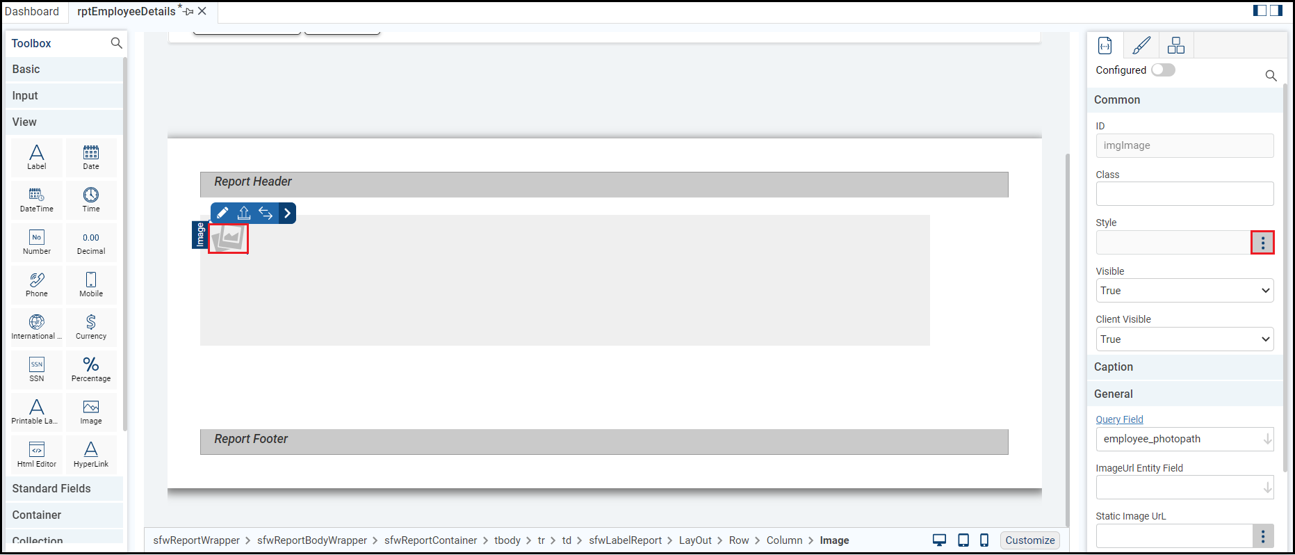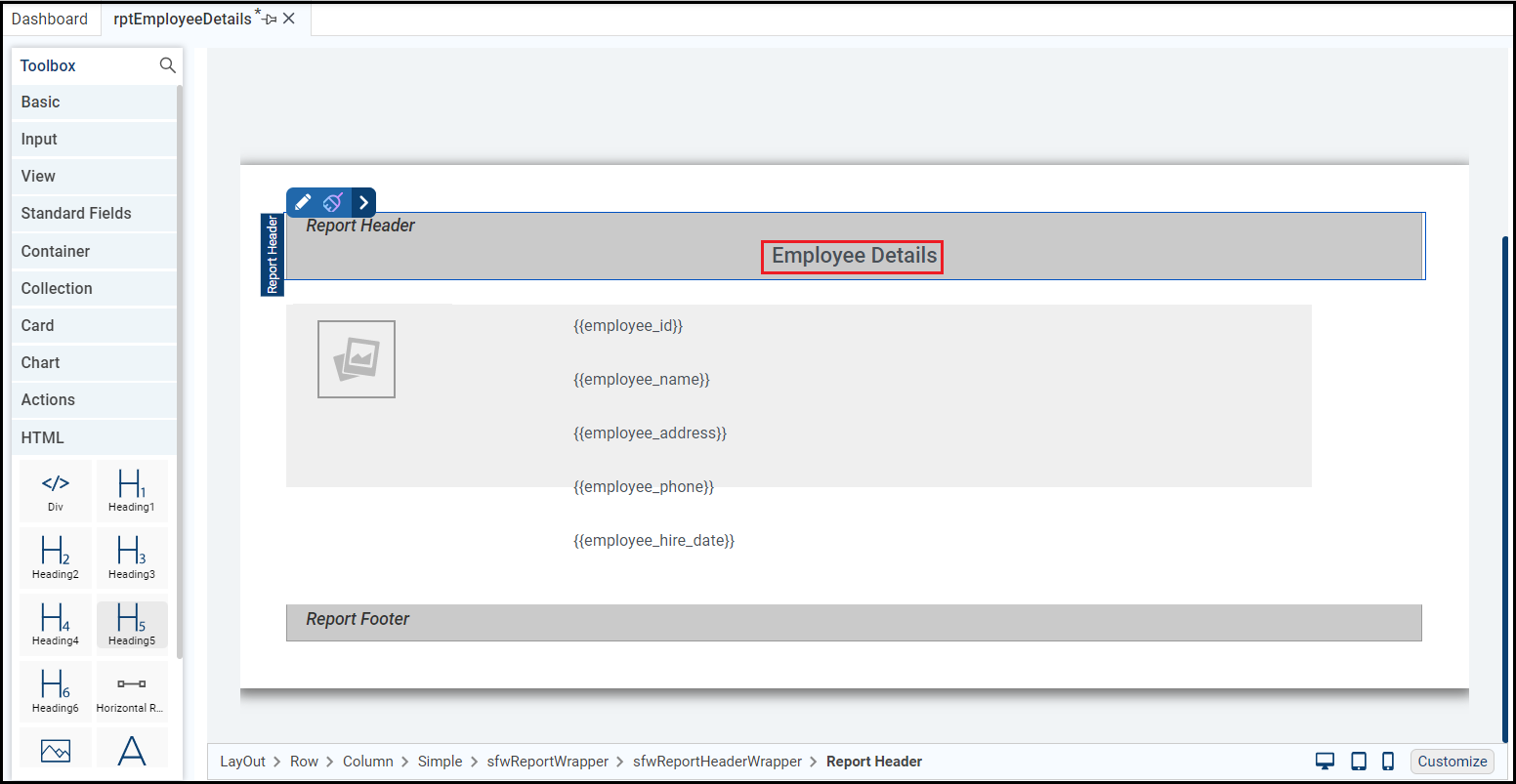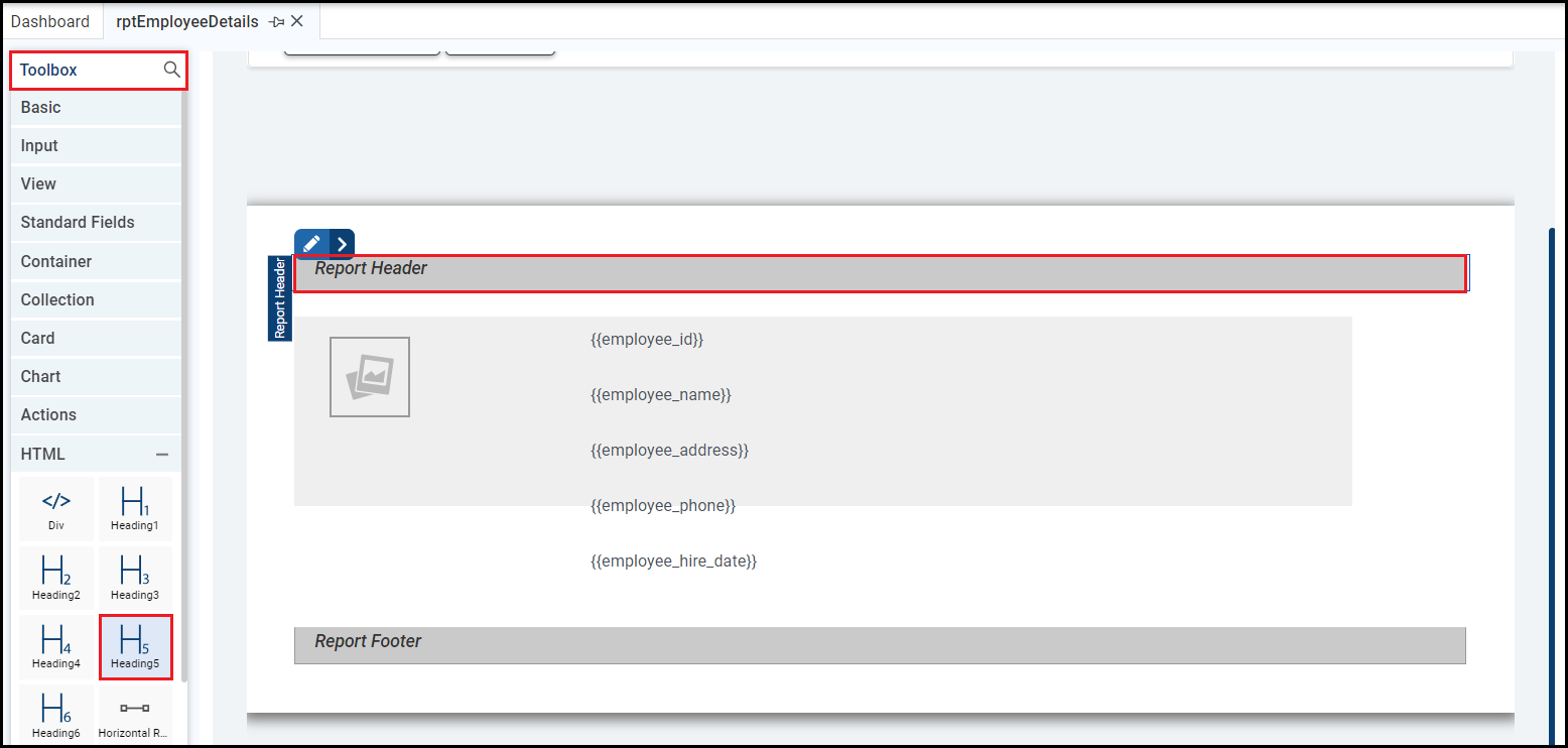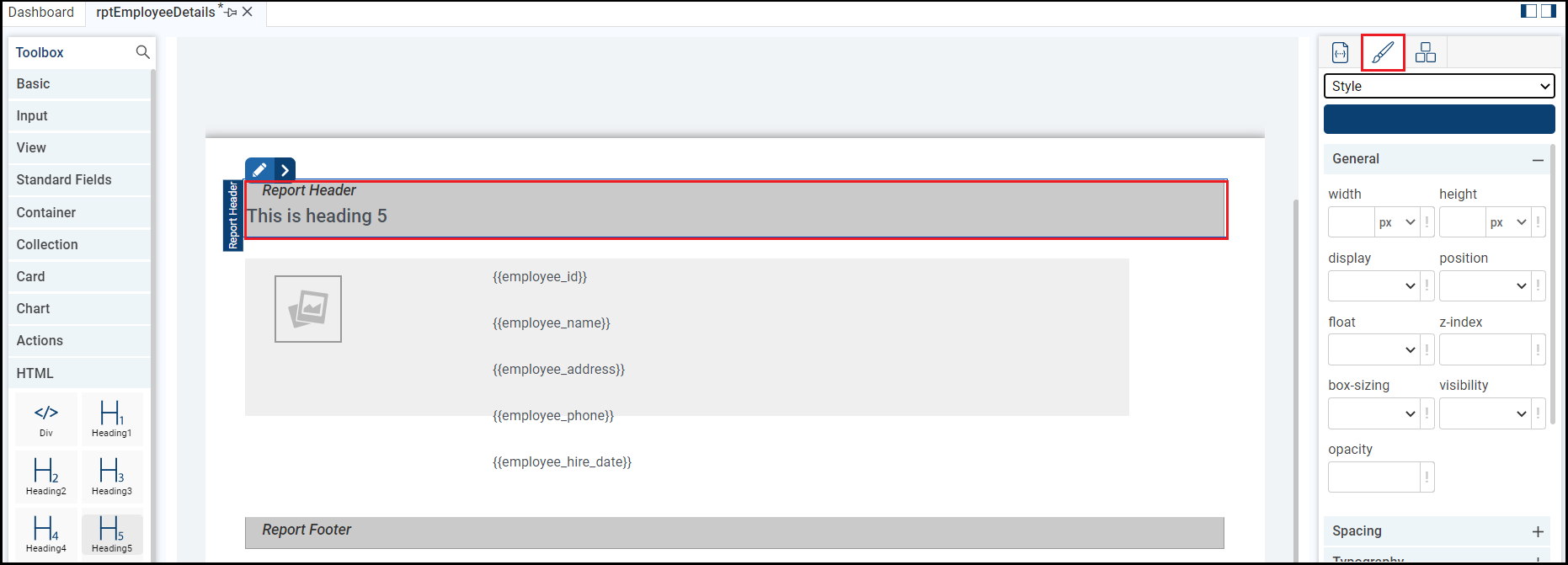 The heading gets added. Now, select the Report Header and open the Style Editor tab. Alternatively, from the Properties, you can click the Edit Control Style icon to open the Style Editor tab.