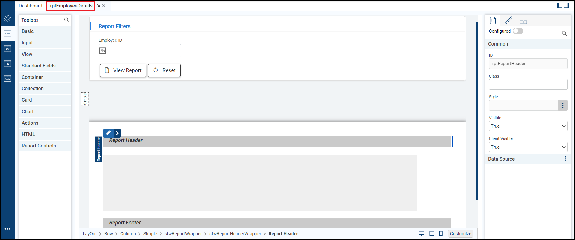This example configures an Employee Details report. It starts with an existing created report and applies the following updates: