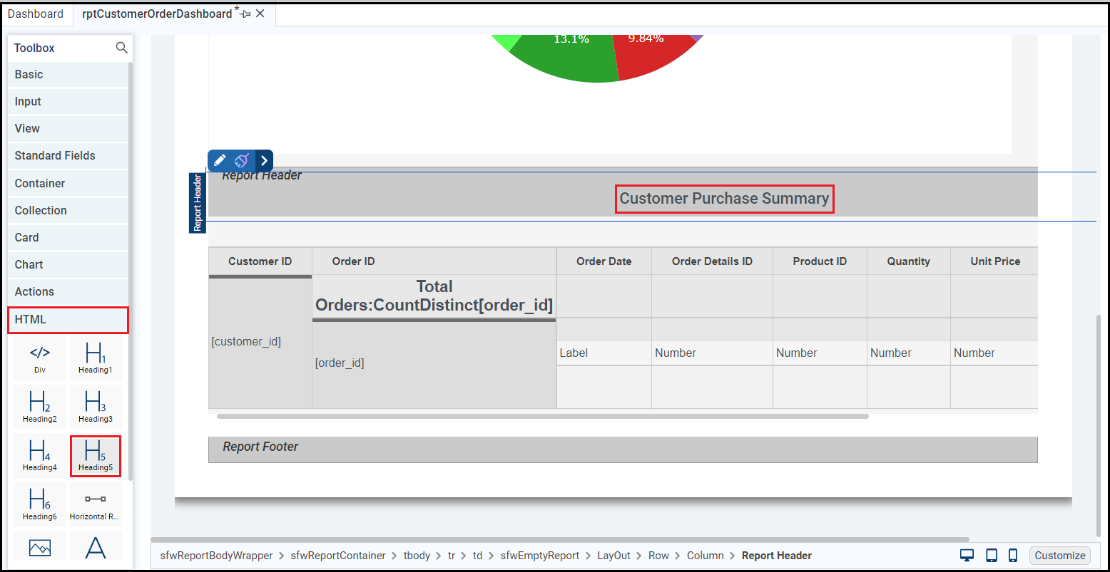 Similarly, add the desired heading control in the Report Header. Edit the heading caption to give a suitable title for a dashboard report. Also, you can apply the desired style properties from the Style Editor tab.