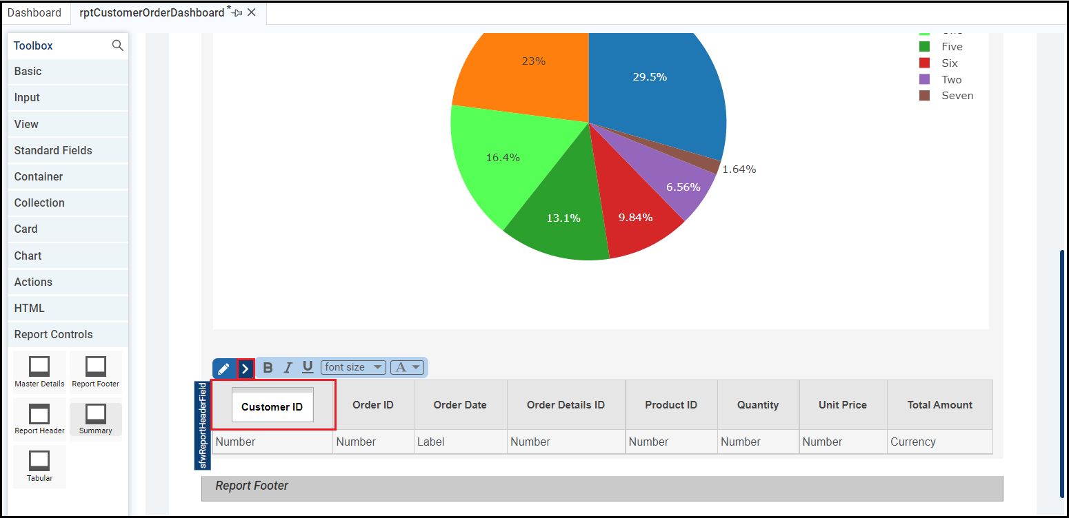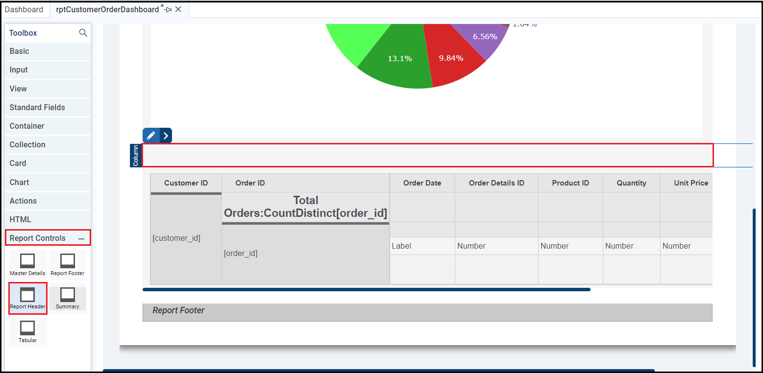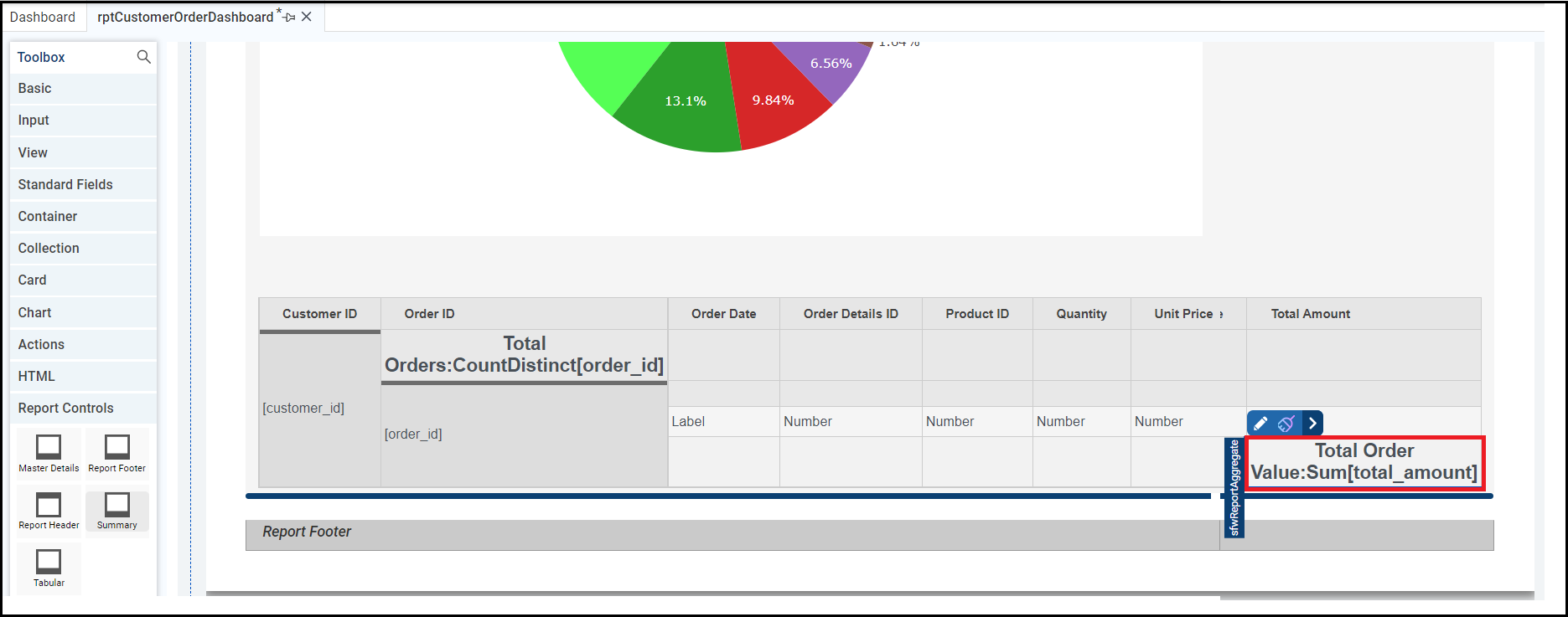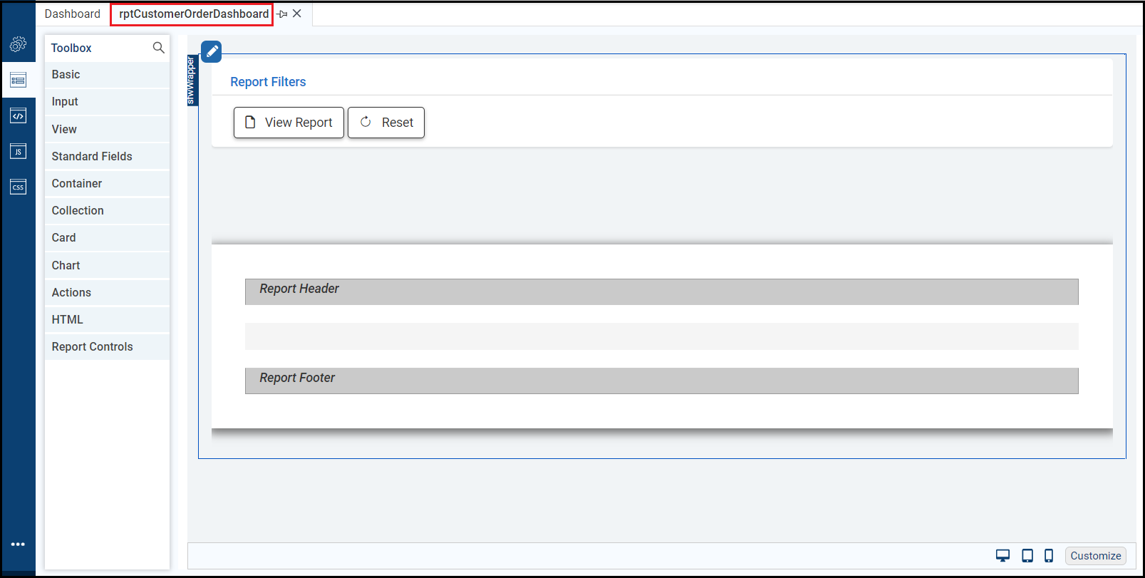 Open the dashboard report file rptCustomerOrderDashboard to do further configurations.