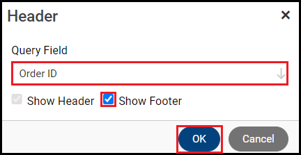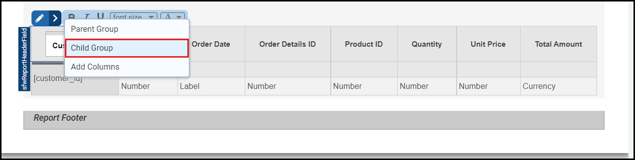 To make a field a child group, select the parent field, click the More icon, and select Child Group. Enter the Query Field and include the footer. Click OK.