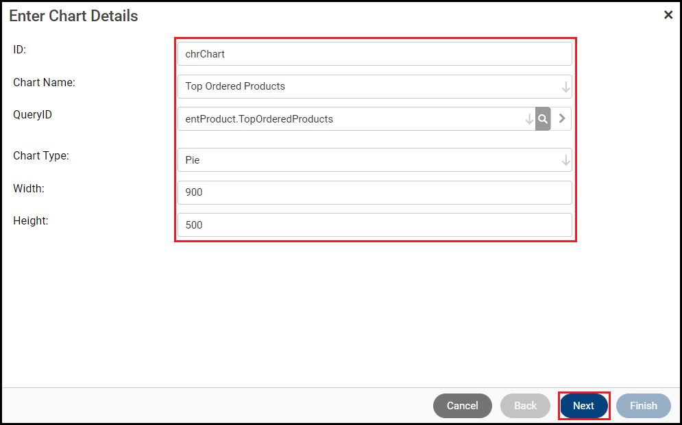 - Query ID: Query the chart is based on. It must exist in the entity before you can enter it here.