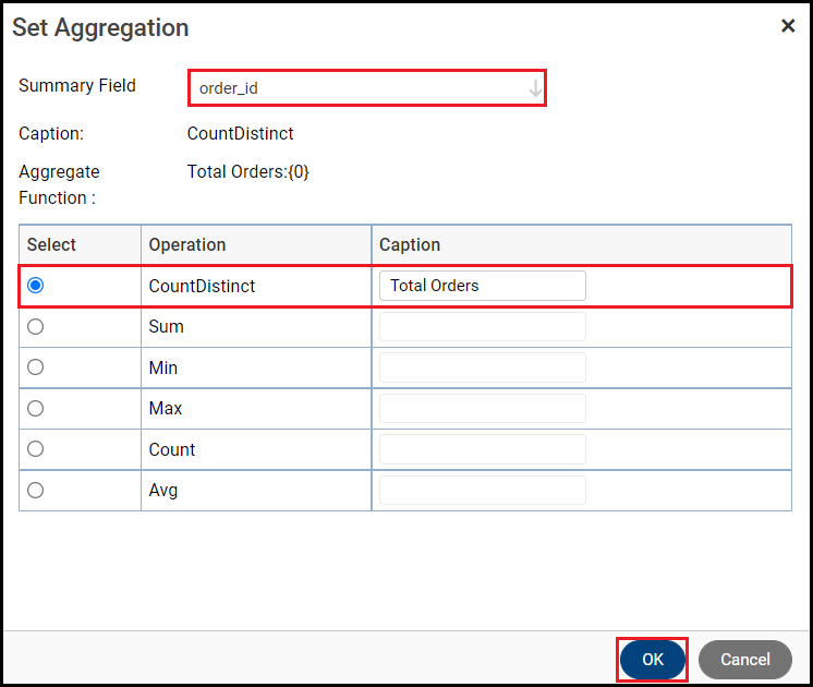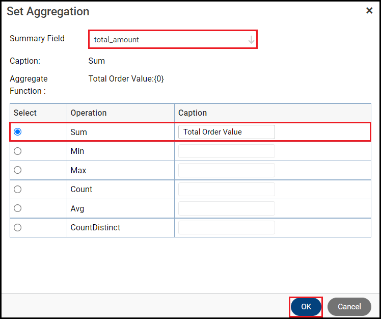 Enter the Summary Field, select the aggregate function, and click OK. Options are:
