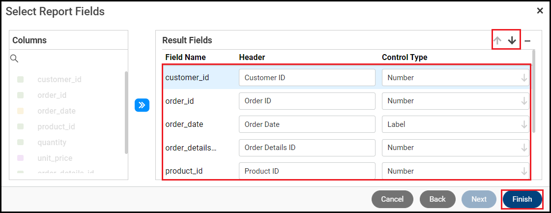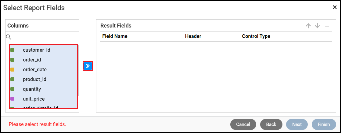 Select the fields you want the report to have and click the Add icon to add them to the report file.