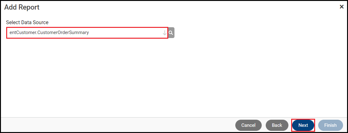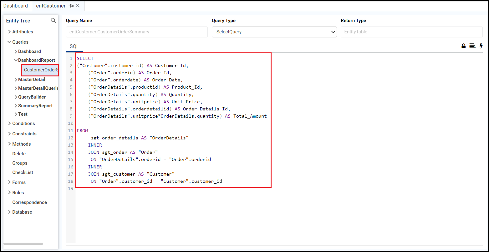 The query CustomerOrderSummary is configured initially when you create the dashboard report.