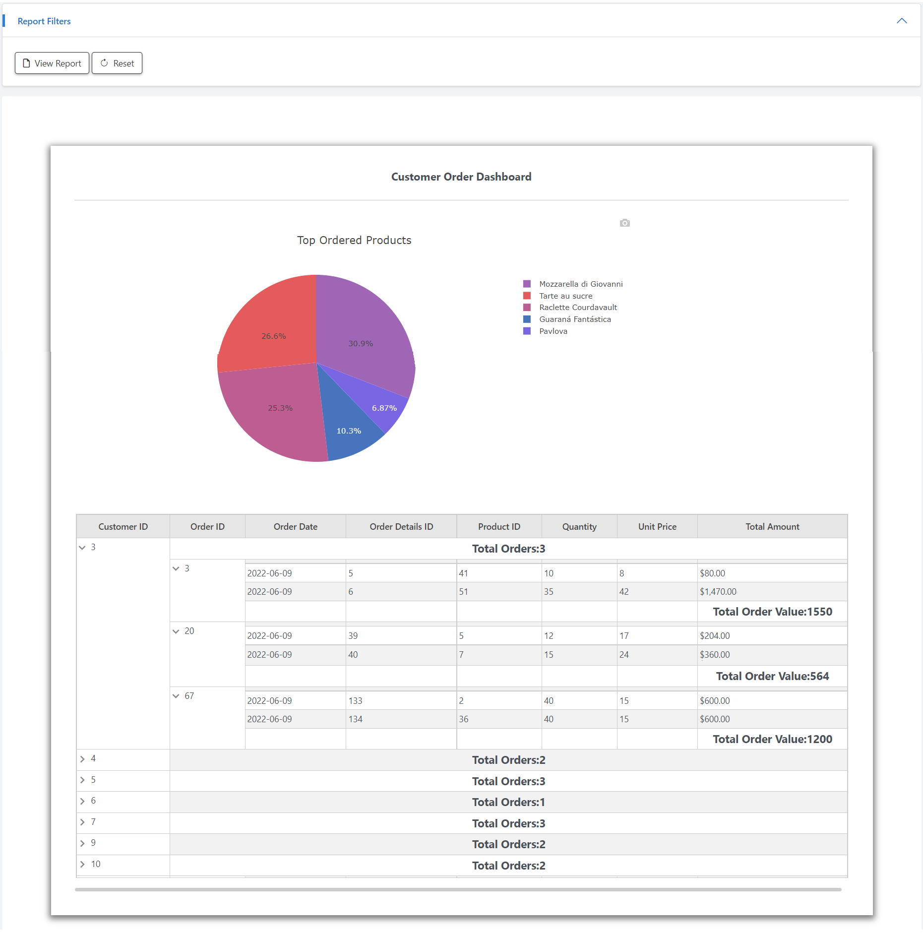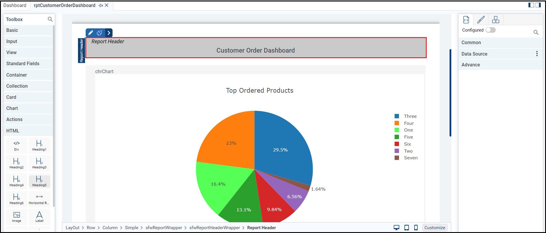 This example configures a Customer Oder Dashboard. It starts with an existing created report and applies the following updates: