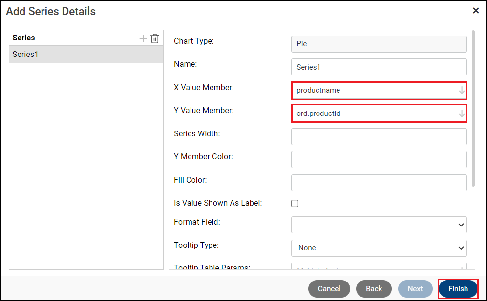 Enter the X Value Member and Y Value Member to determine how the chart displays the query data.