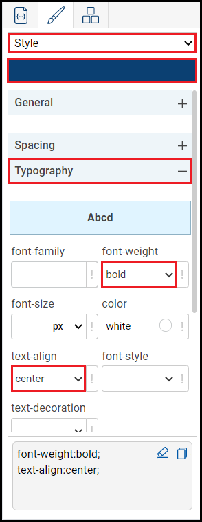Select the Style option from the dropdown list. Open the Typography section. Select the desired style properties and click the Apply Style button.