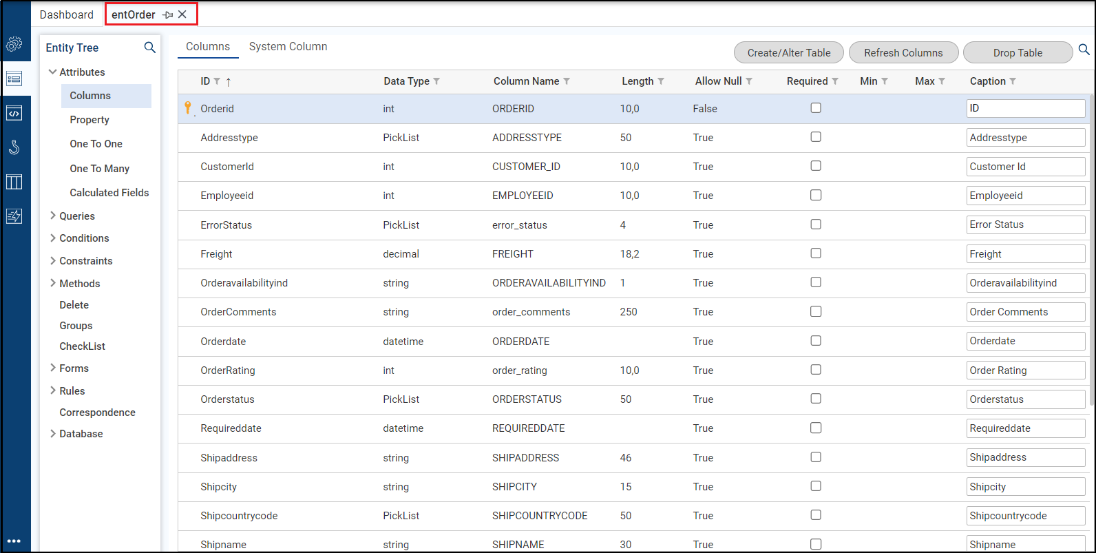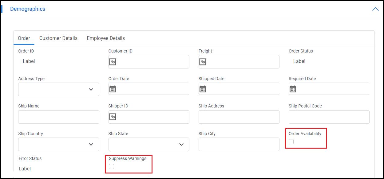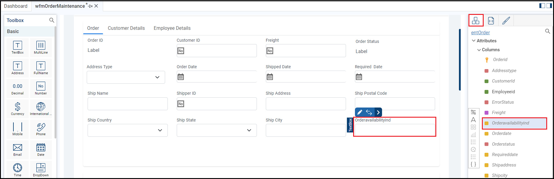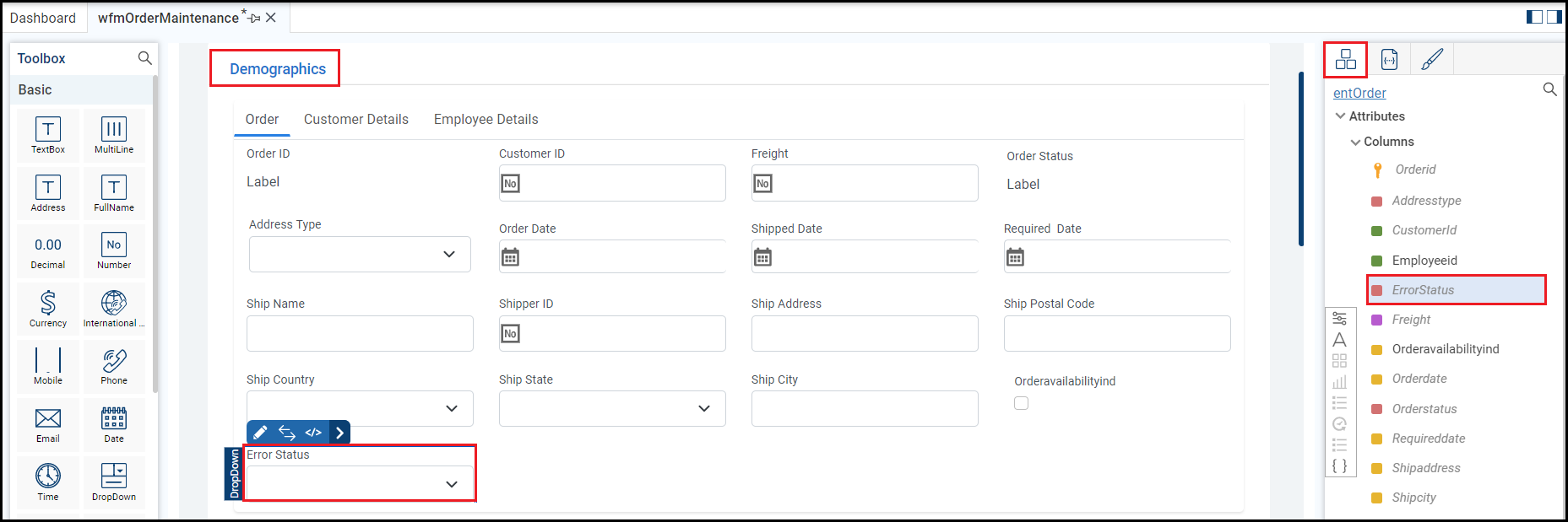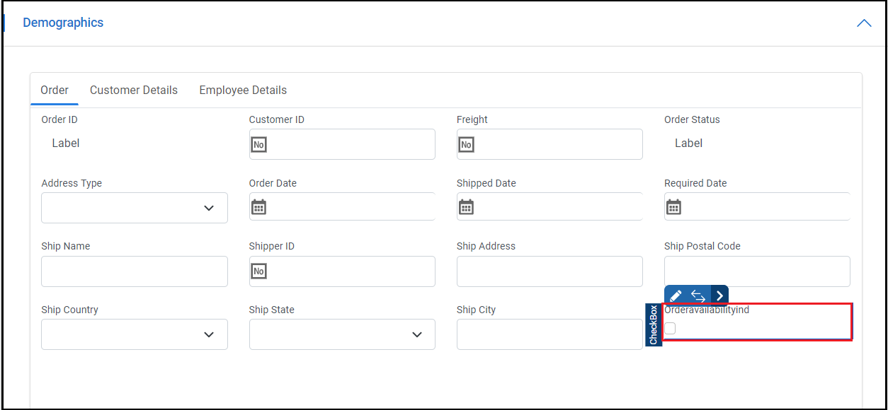 Drag and drop the Orderavailabilityind field from entity attribute to the desired location in the demographics section.