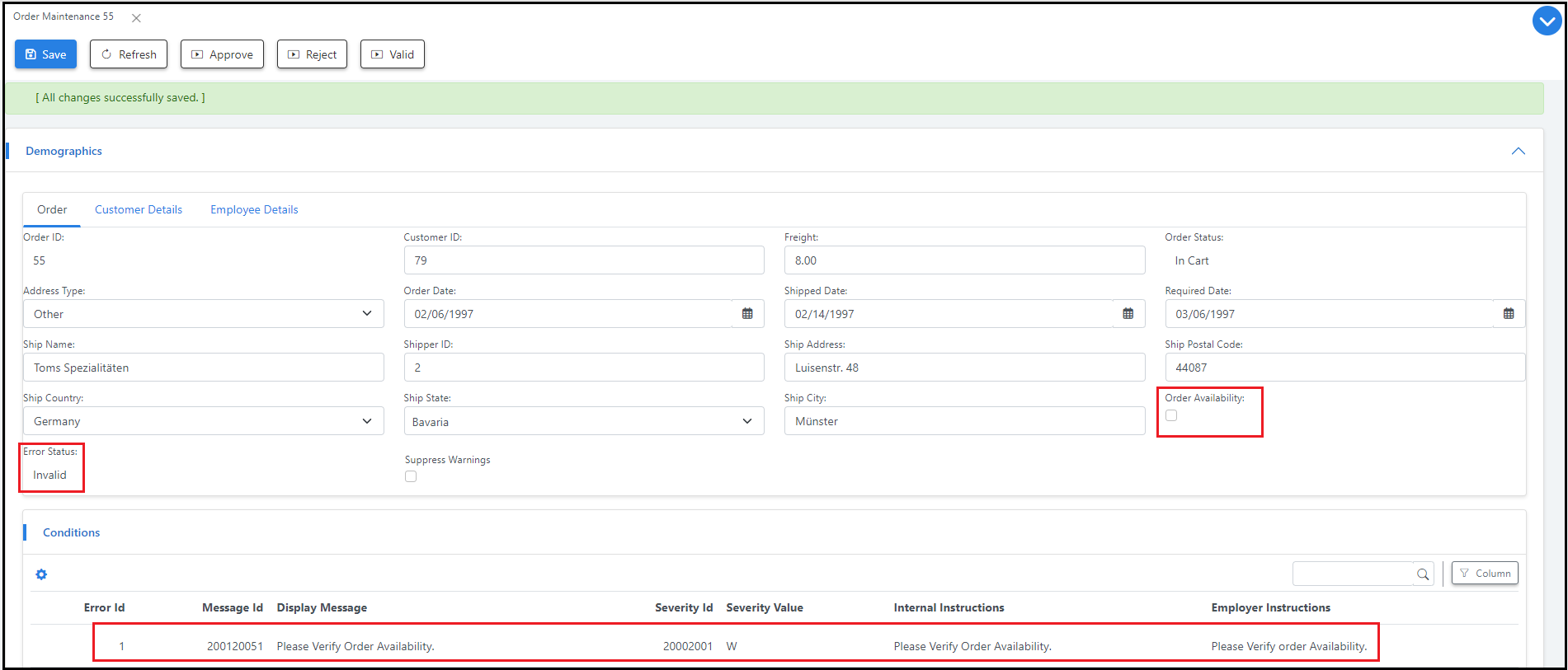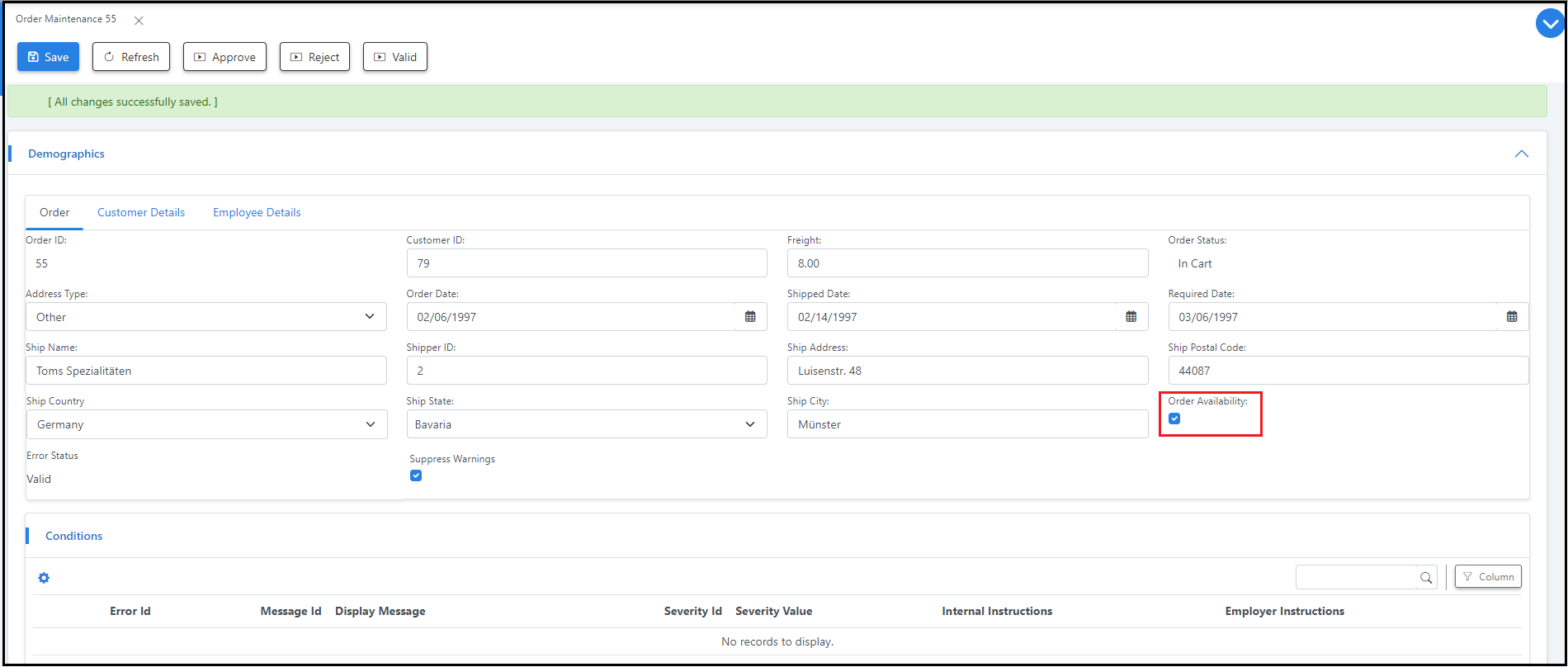 Update the UI as necessary to administer the error. In this example, the form must have the Order Availability checkbox so the user can either indicate the order is available or not available.