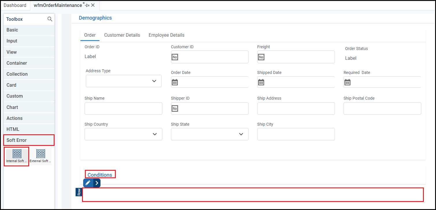 The Internal Soft Error control has been added to the Conditions collapsible control. For this control to work correctly, the entity must be configured.