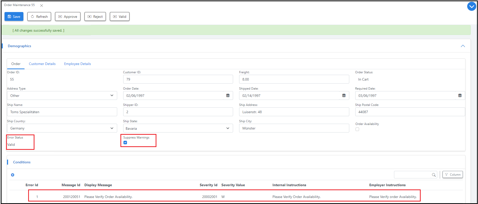 If you update the record, i.e. Order Availability is certified, so it no longer meets the condition, the app will update the status to Valid and remove the error from the error collection.