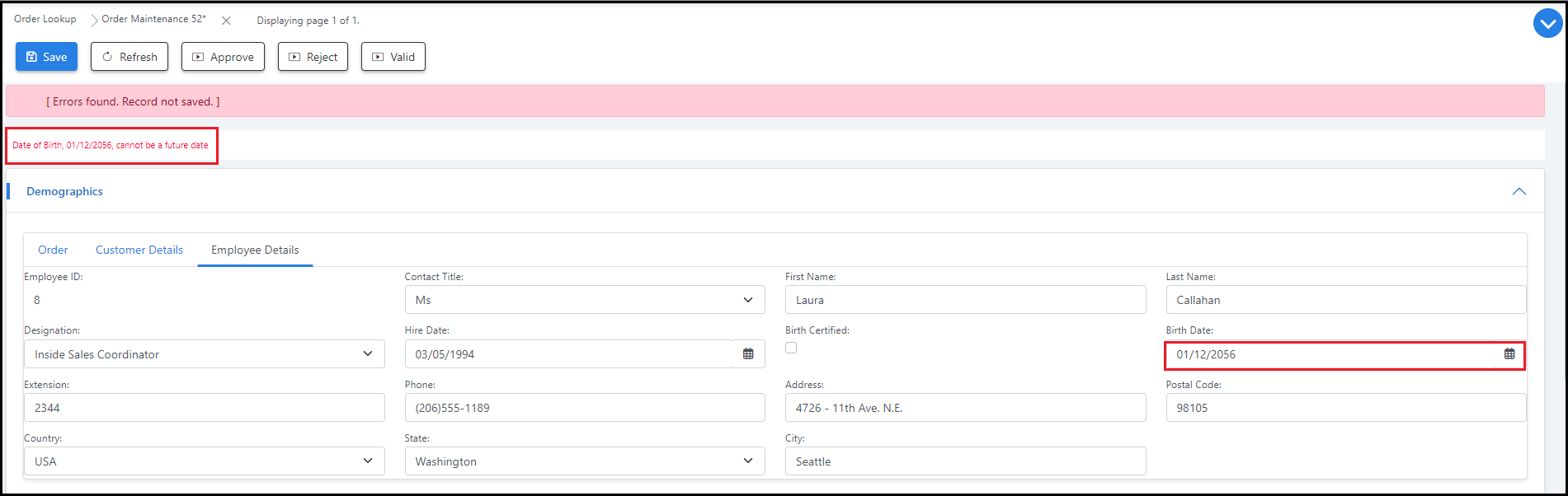 For example, a server error without any formatting might display the message, "Date of Birth cannot be a future date." But a formatted error could specify the actual date the user entered, as follows: "Date of Birth, 01/01/2050, cannot be a future date". Formatting the server error in this way can make it easier for the user to understand why their data is invalid and how to edit it.