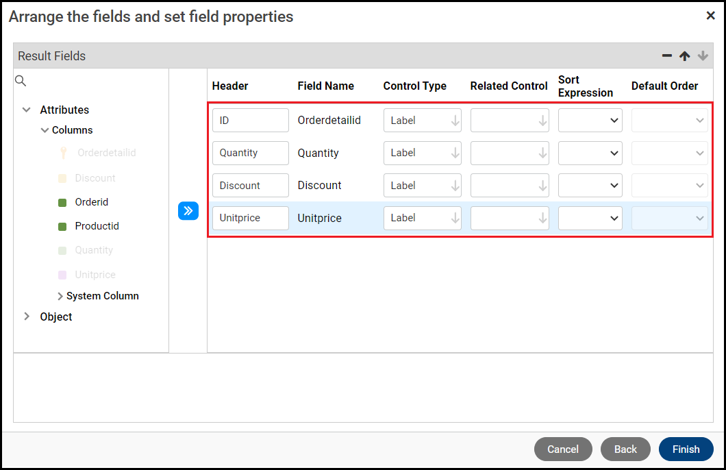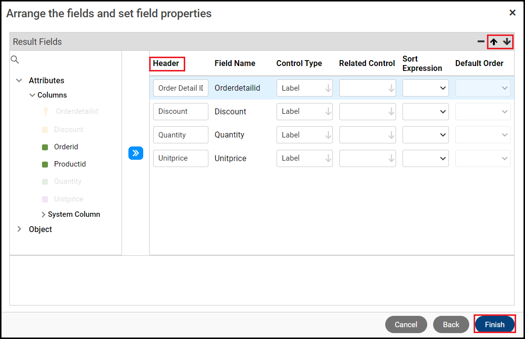 You can update the properties or move the fields with the arrow icons to configure their order in the table. Think about what would make sense to users looking at the data table. Click Finish.