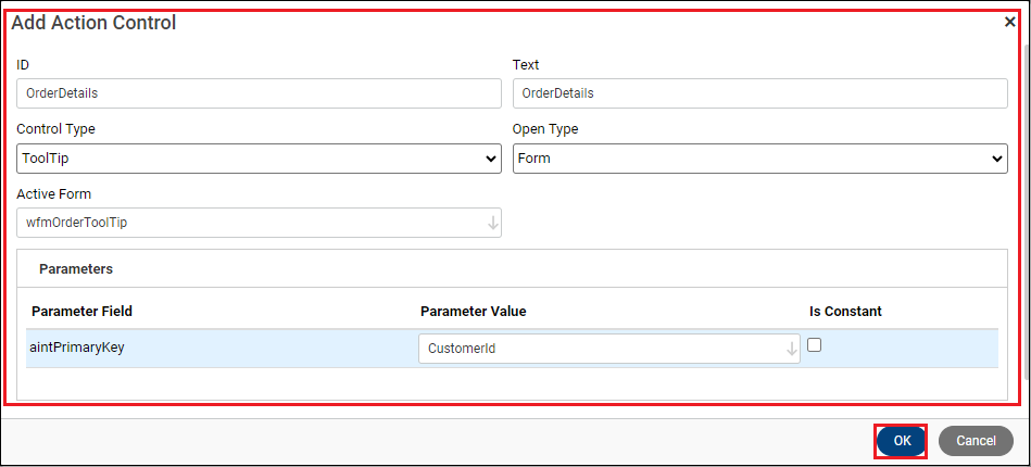 Map the tooltip you want to use, as well as its parameter. This example uses wfmOrderTooltip and CustomerId.