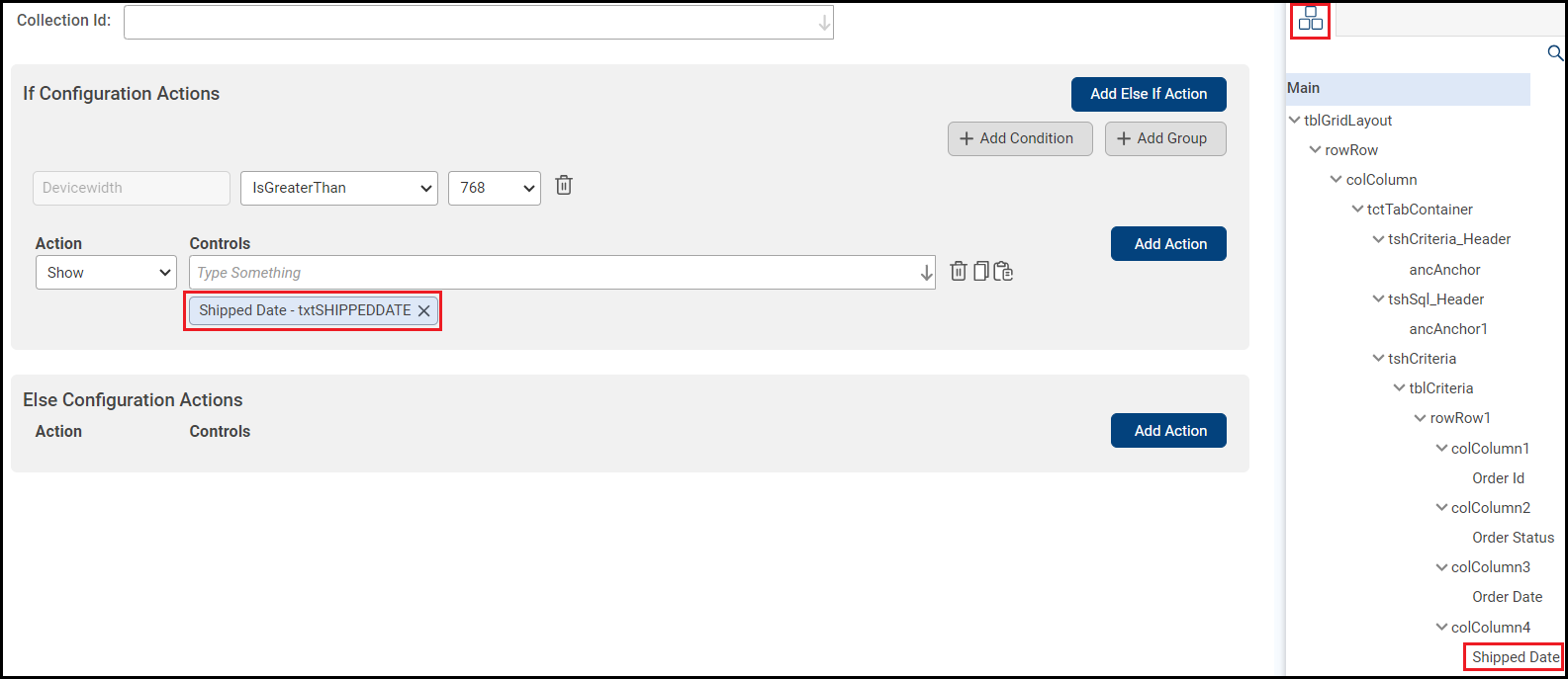 This example uses the Action Type of Show and the Control of the Shipped Date textbox in the Criteria section.