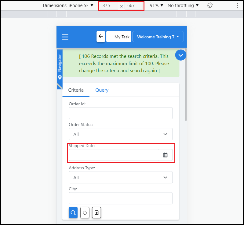 In the following example, the user's device is iPhone SE, hence the width is less than 768. So, only Shipped Date is present in the Criteria section.