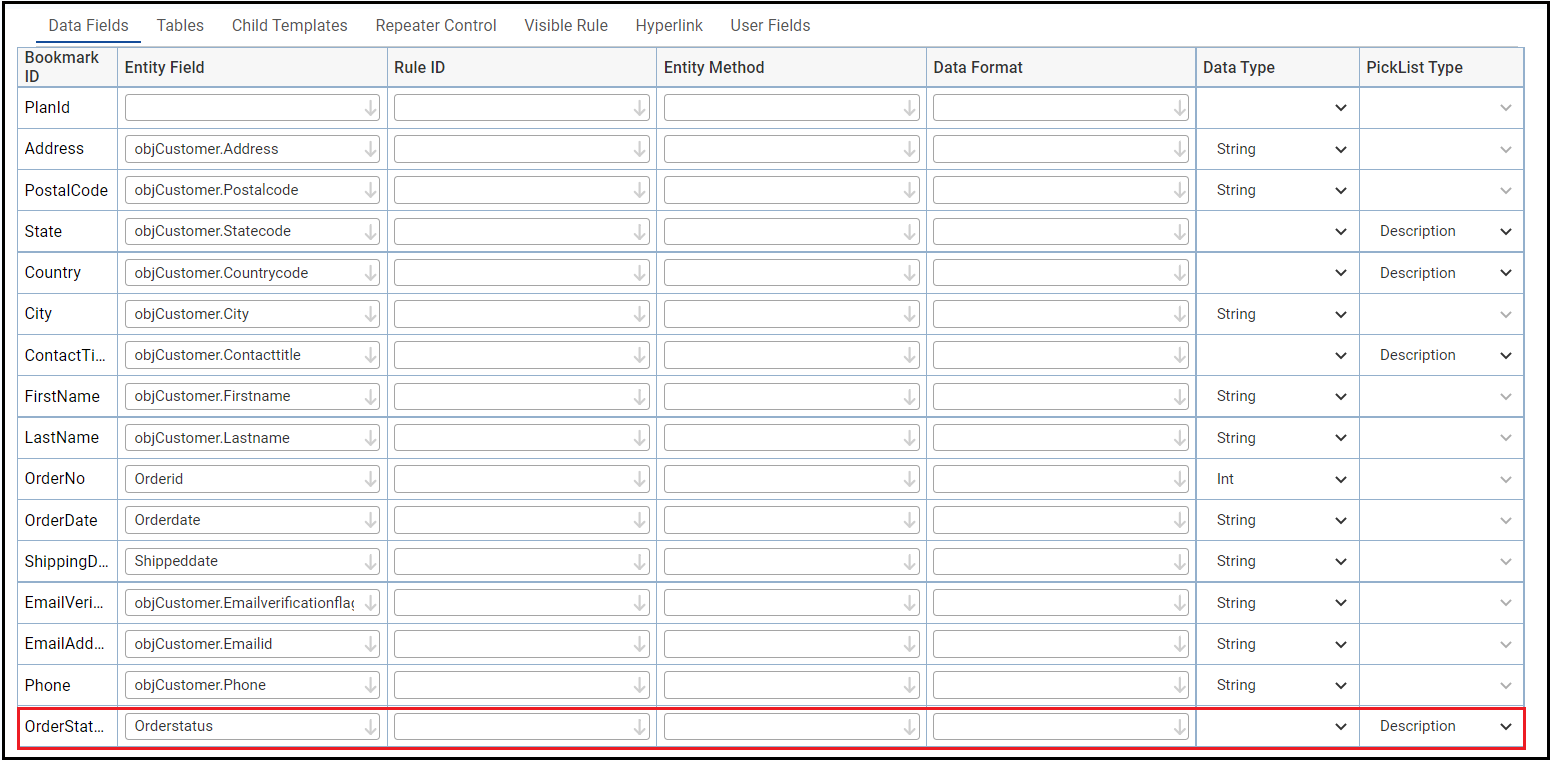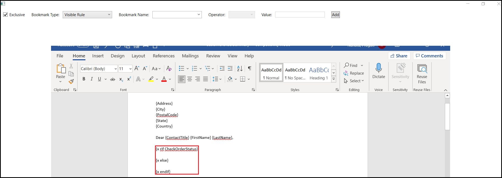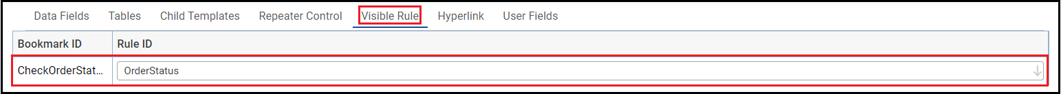 In this example, visible rule bookmark displays one block of text if the value of OrderStatus is ORDR and another block of text if the value is not ORDR.