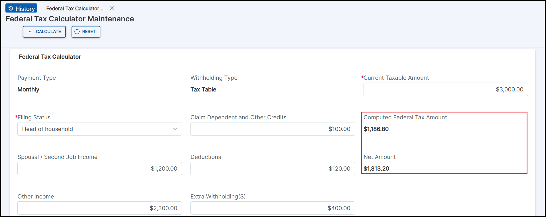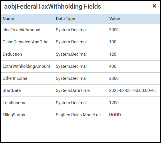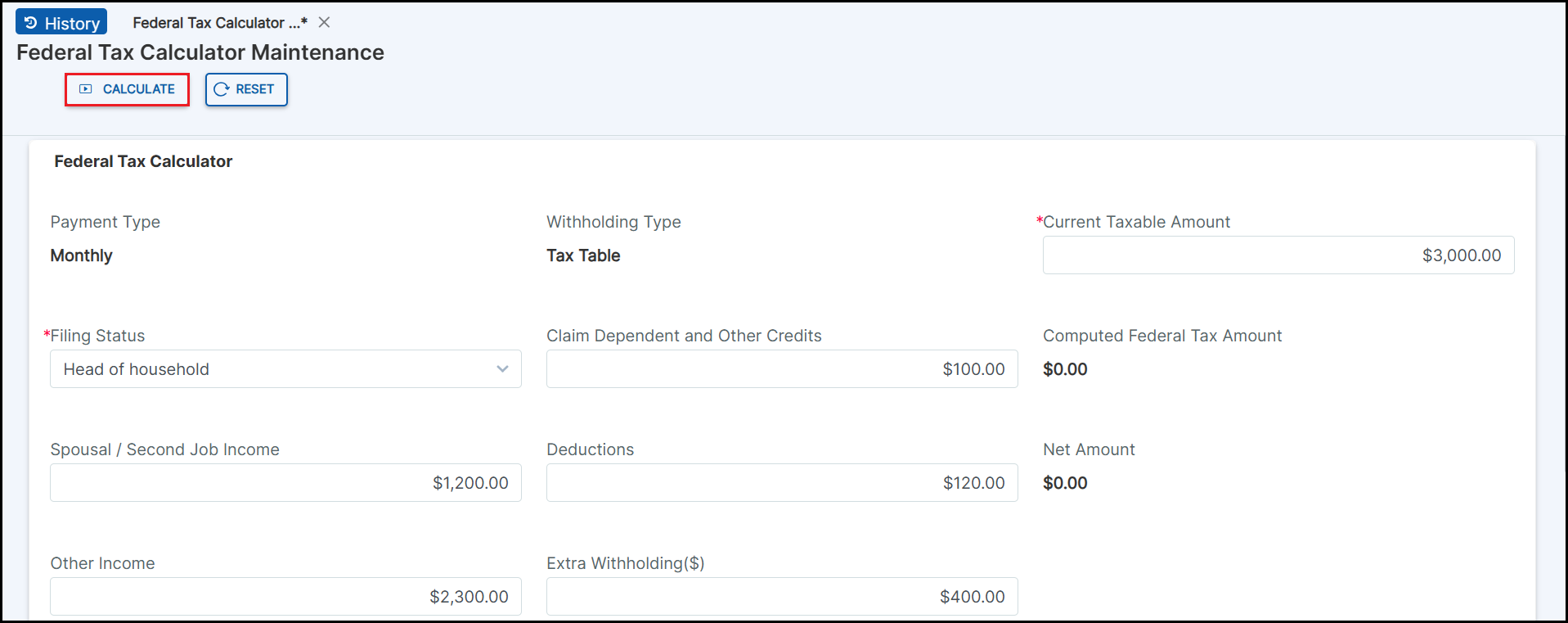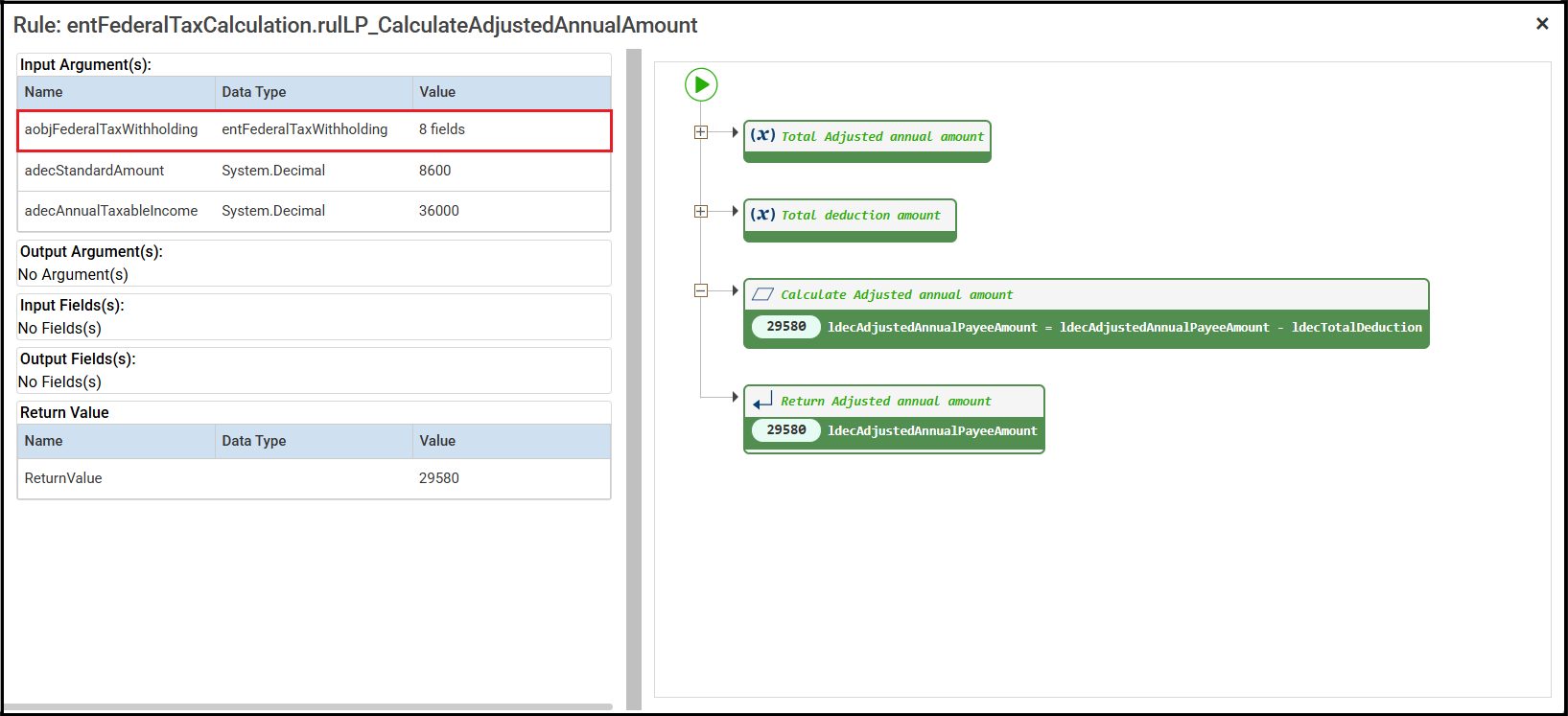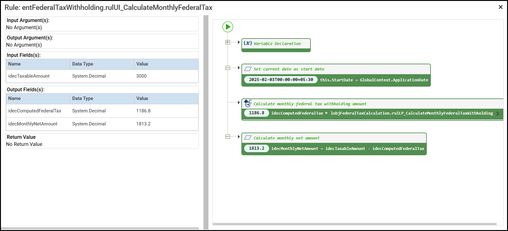 In this example, enter the input data and click the Calculate button to execute the underlying logical rule. In this case Federal Tax Calculator Maintenance is opened.