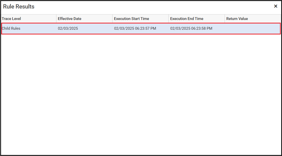 The return value, if any, gets displayed. You can double-click the list item to open the execution diagram of the current rule.