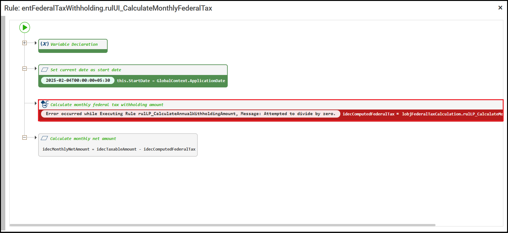 There may be a business need to trace the rule execution flow — for example, to identify where the rule execution has stopped or to investigate unexpected results. In such cases, rule tracing can be enabled. It allows you to monitor the current rule and also drill down into any child rules. If an error occurs, the trace highlights the exact step where it happened.